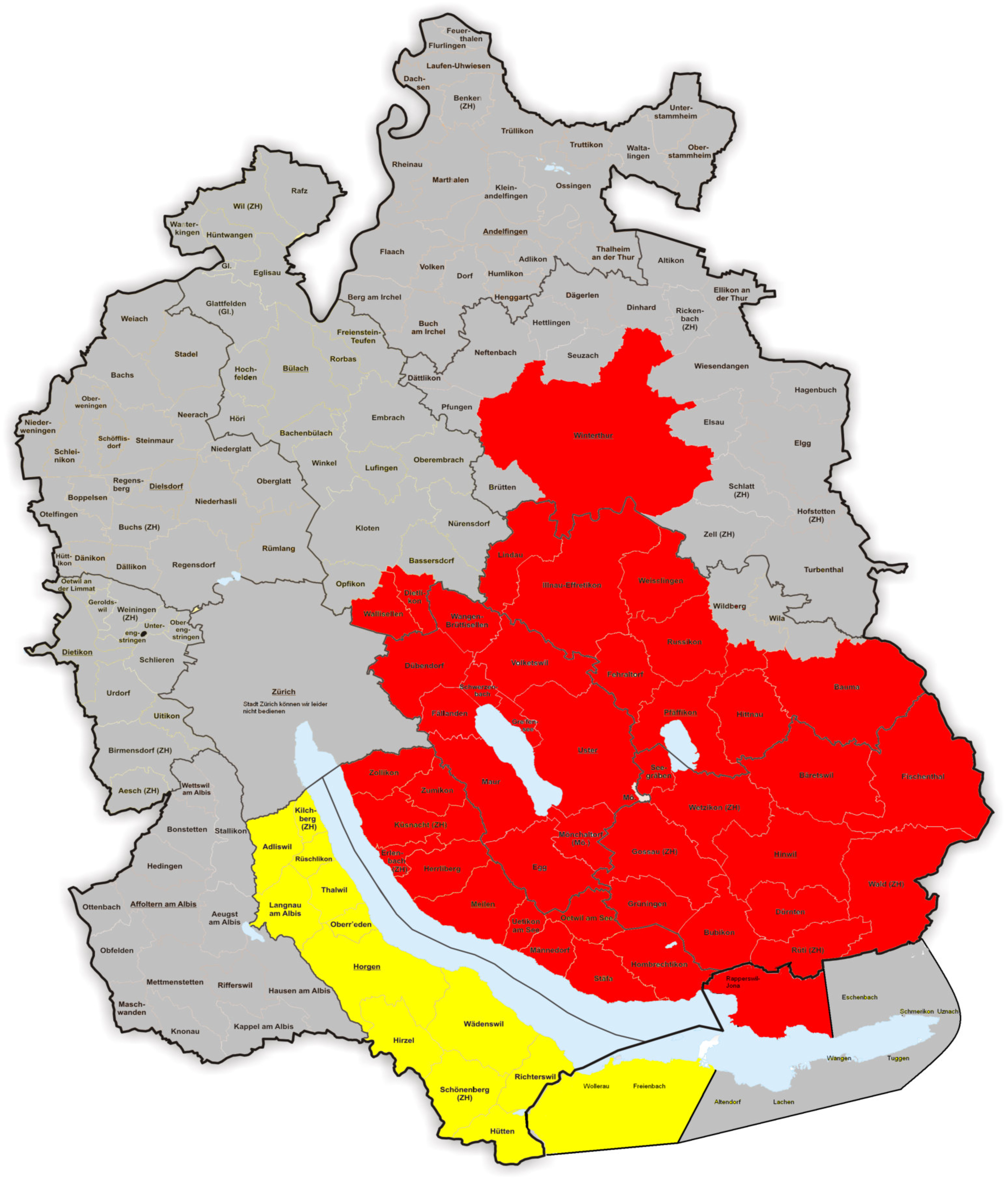 Unsere Einsatzgebiete sind die Bezirke Hinwil, Uster, Pfäffikon, Winterthur und Meilen sowie Rapperswil-Jona. (Rot markierte Gemeinden)Unsere Mitarbeiter sind gleichmässig auf diese Gebiete verteilt, so können wir die Anfahrtskostenäusserst günstig halten.Unabhängig von Wegzeit, Km und Stau, berechnen wir Ihnen lediglich eine Anfahrtspauschale vonFr. 35.--, keine Km Verrechnung. Die Arbeitsstunden berechnen wir erst ab ihrem Wohnort, Mindestverrechnung 3 Stunden + Fr. 35.--Fahrzeit, Fr.194.--Auf dem Gemeindegebiet von Gossau ZH, unserem Hauptsitz, keine Anfahrtskosten----------------------------------Linkes Zürichseeufer: gelb Markiert 2x 30 Min. Wegzeit + Fr. 20 FährverbindungMindestauftrag/Verrechnung 4 Stunden.------------------------------Umliegende Gemeinden: grau Markiert, Wegzeit und Km Verrechnung auf Anfrage. Diese Gemeinden liegen ausserhalb von unserem Aktionsradius, Bedienung ab min. 5 Arbeitsstunden.,Weiter entferntere Einsatzgebiete gegen Anfahrtszuschlag, Verrechnung Fahrzeit und Fr.0.65/Kmbitte unverbindlich anfragen.